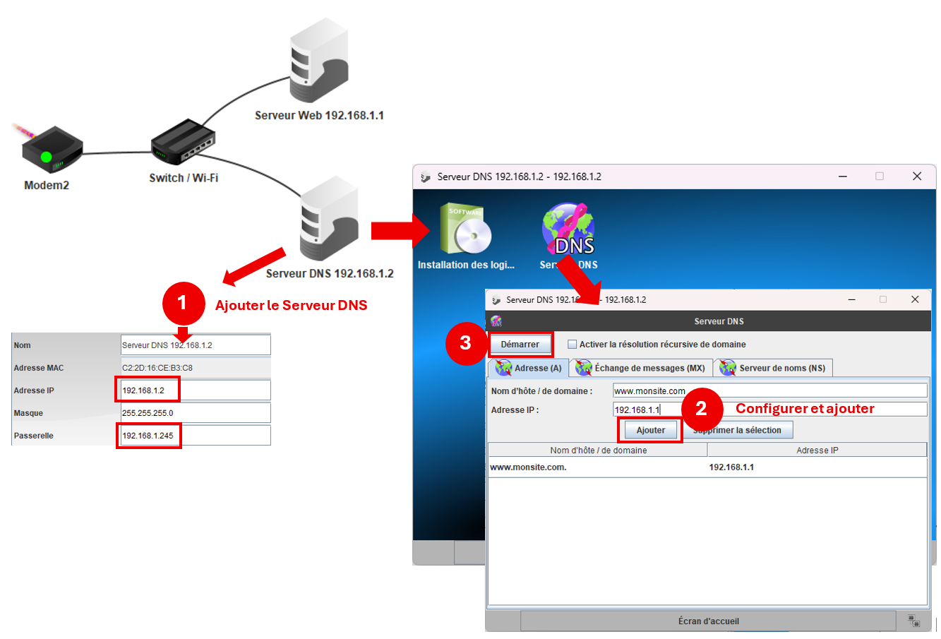 - Pour cela nous avons donc besoin d’ajouter un serveur DNS qui fera le lien entre l’adresse IP 192.168.1.1 et le nom de notre domaine www.monsite.com