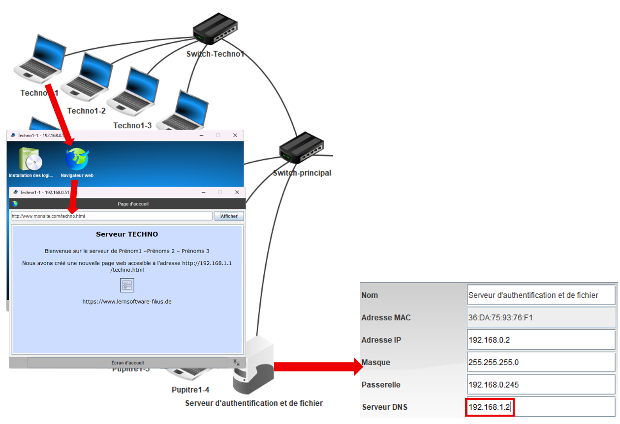 - Sur le poste Techno1-1, lancer le Navigateur WEB, puis taper l’adresse du serveur Web http://www.monsite.com/techno.html, votre nouvelle page Web doit s’afficher.