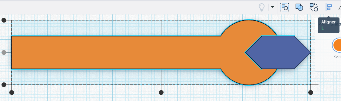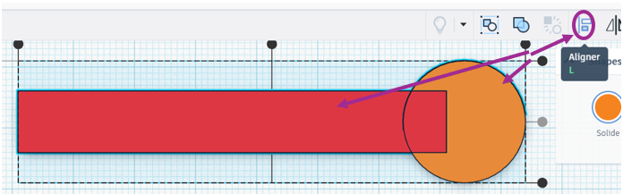 - Vous pouvez déplacer les formes en les faisant glisser sur le plan de travail. Placez-les de manière à ce qu’ils se touchent. Pour les aligner parfaitement, sélectionnez les deux pièces (MAJ+Clic) puis aligner.