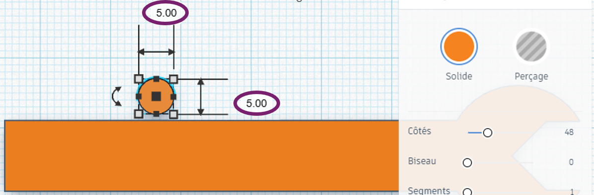 - Passons ensuite au trou traversant. Placez de nouveau un cylindre, dont voici les cotations :