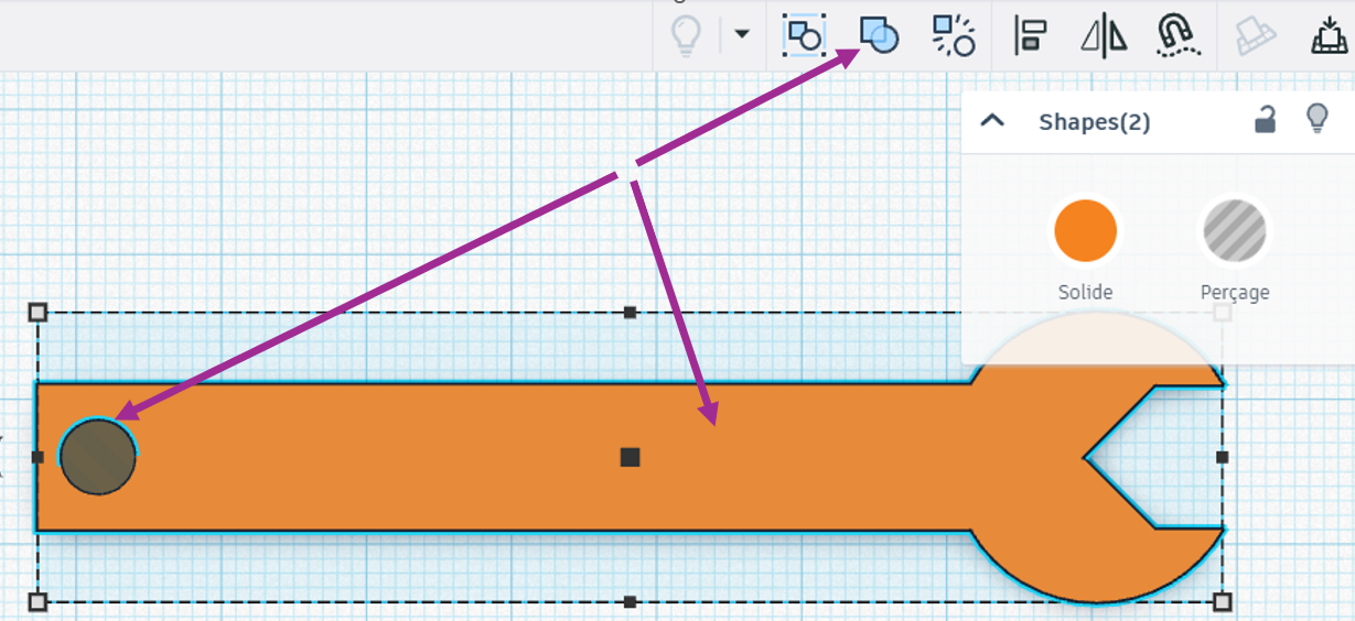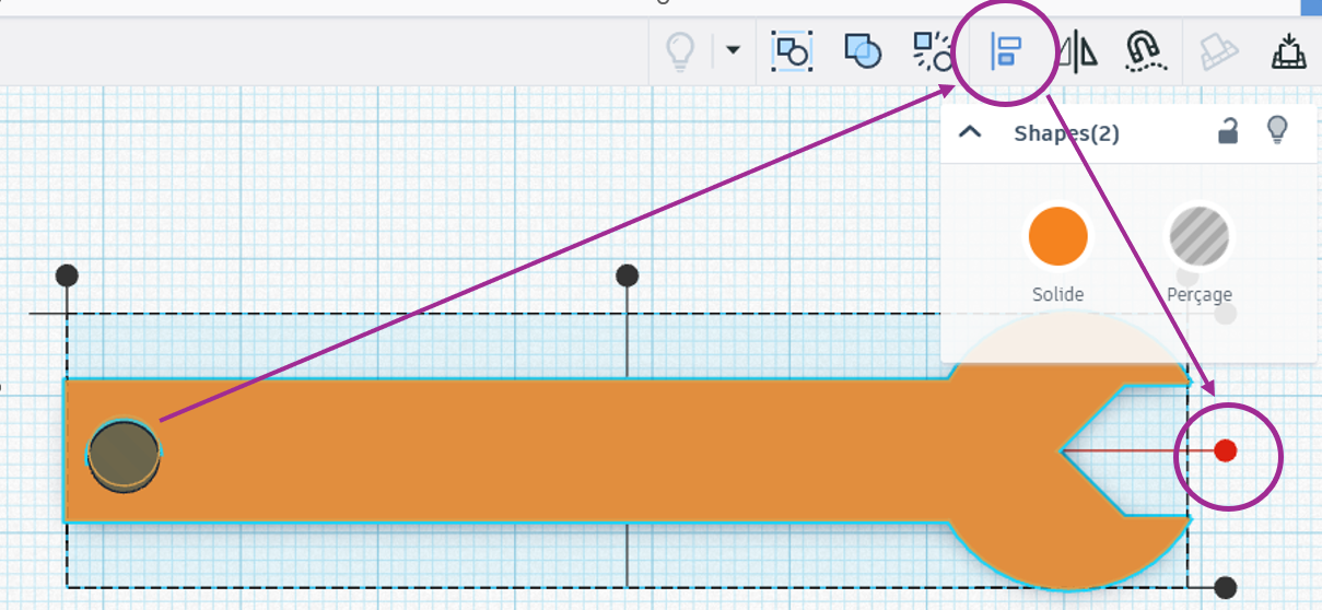 - Placez le petit cylindre par dessus la clé, donnez lui la fonction “perçage”; sélectionnez-les tous les deux et cliquez sur l’icône “Aligner”