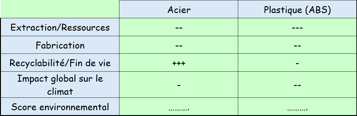 - Calculez dans le tableau le score environnemental de chaque solution, sachant que "+++" vaut 3 points, "++" vaut 2 points, "+" vaut 1 point, "-" vaut - 1 point, "--" vaut -2 points,"---" vaut -3 points.