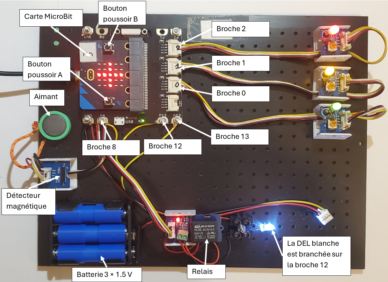 - En observant la photo ci-dessous et la platine de câblage sur votre table, indiquez sur le document réponse sur quelle broche sont branchées les DEL: verte, jaune, rouge et blanche.