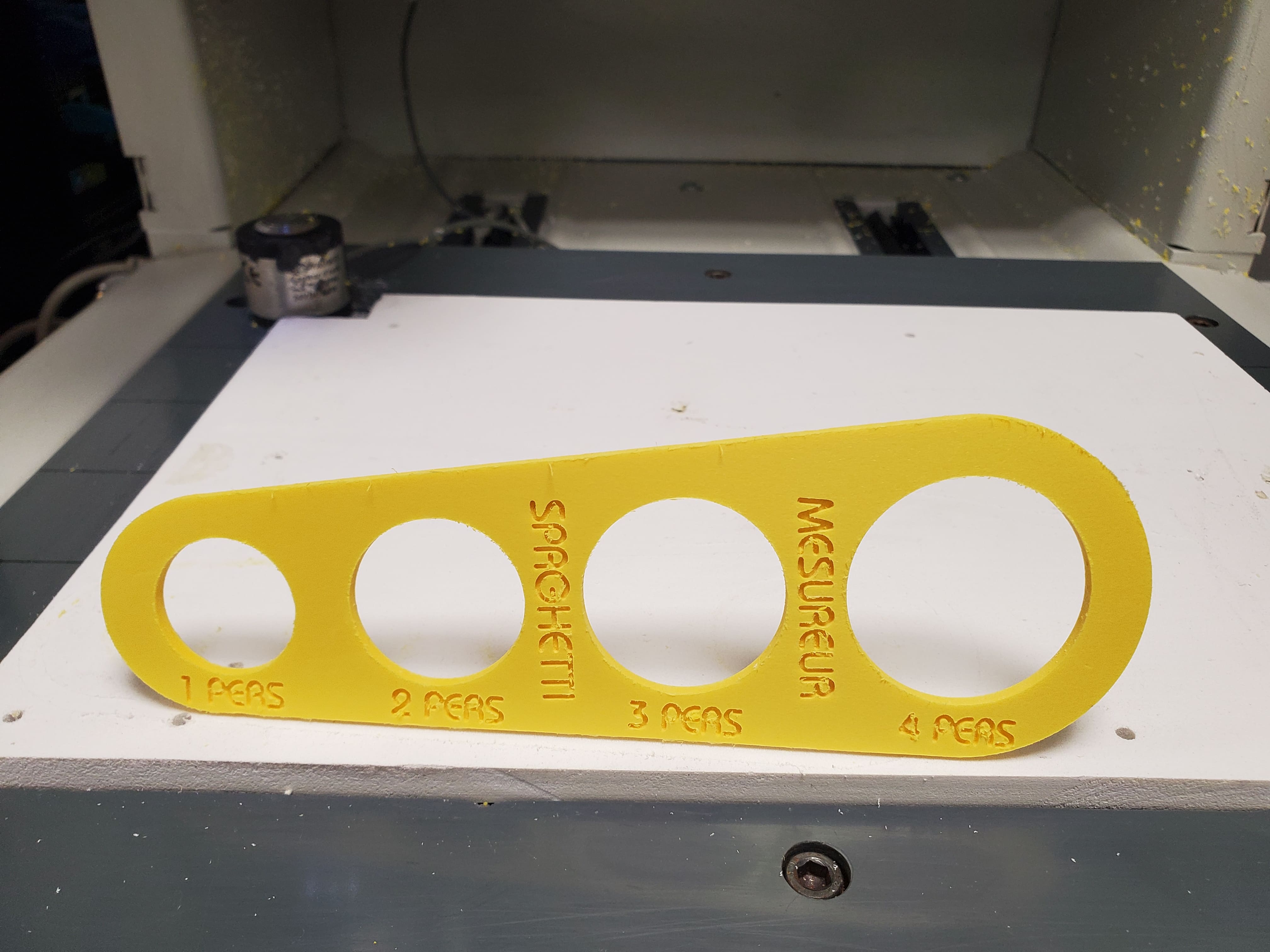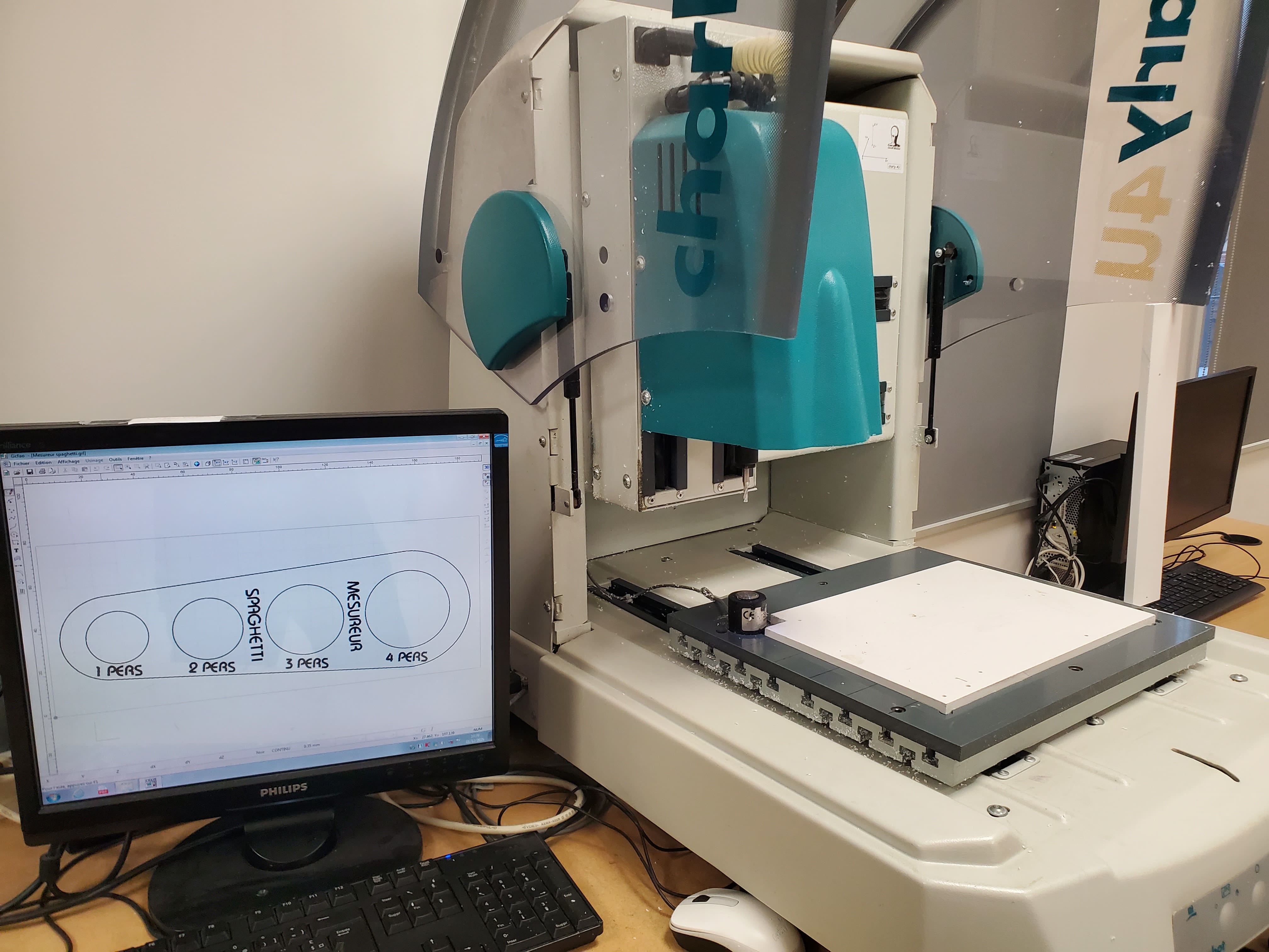 Une fois l’usinage terminé, on ouvre le capot de protection, on retire la pièce et on peut observer le résultat : une forme découpée avec précision selon le dessin préparé à l’ordinateur.