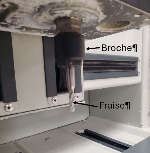 On installe ensuite la fraise dans la broche à l’aide d’une pince, puis on règle l’origine pièce, qui sert de point de départ à la machine.
