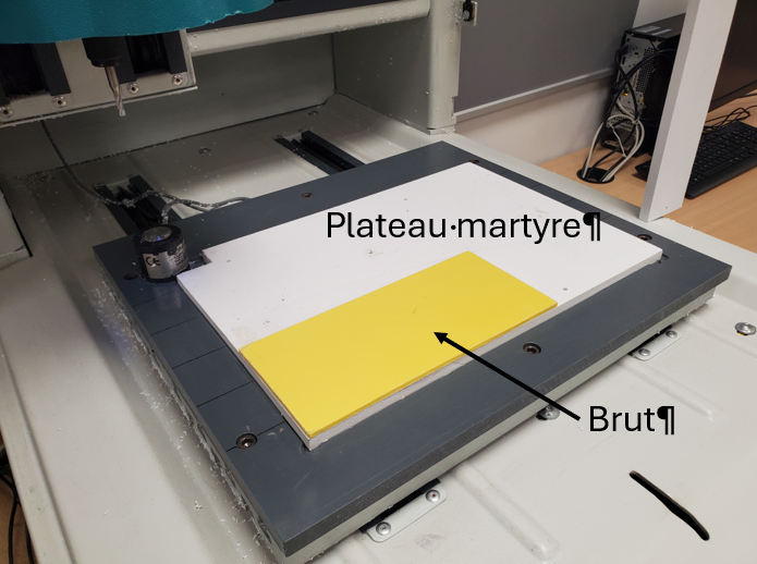 Avant de lancer l’usinage, on fixe le brut (le morceau de matière) sur le plateau avec du scotch double face, souvent sur un plateau martyr qui sert de protection.