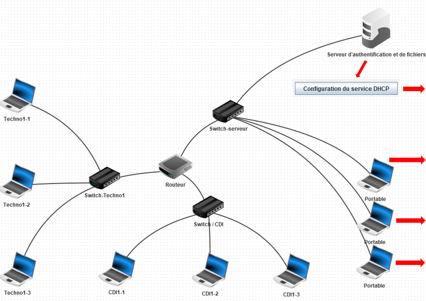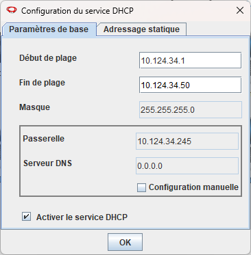 - Configurez le service DHCP comme indiqué ci-dessous afin que le serveur attribue automatiquement les adresses IP des 3 nouveaux PC.