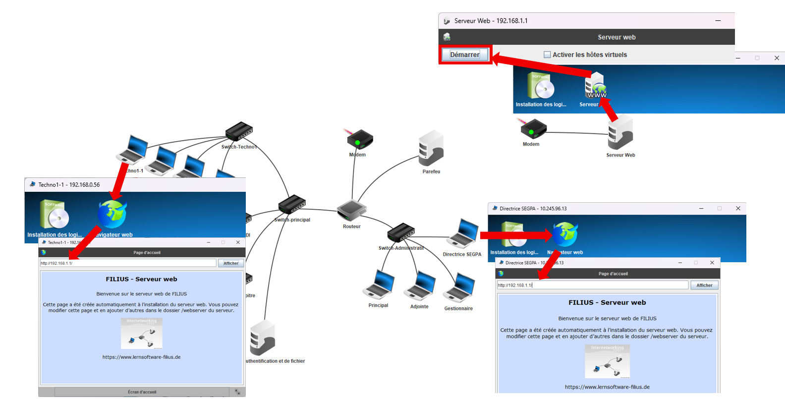 - Sur le poste Directrice SEGPA, installer et lancer le Navigateur WEB, puis taper l’adresse du serveur Web http://192.168.1.1, la page FILIUS – Serveur Web doit s’afficher