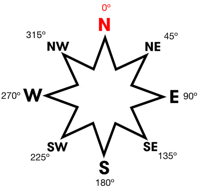 Chaque orientation correspond à une mesure angulaire d'un cercle (en degré). Le Nord correspondant à 0°.