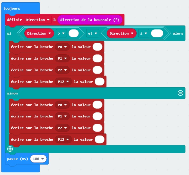 Programme n°1: Allumer une led verte (la led verte est branchée sur la broche P0) lorsque la boussole est orientée à l'Est entre 45° et 135°