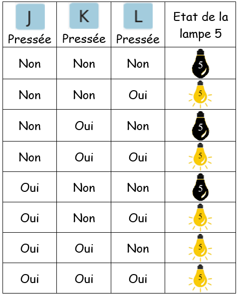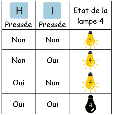 - Observez les 4 cas cas de la situation 1, la lampe 1 est allumée uniquement si les touches 'B' et 'C' du clavier sont appuyées simultanément.